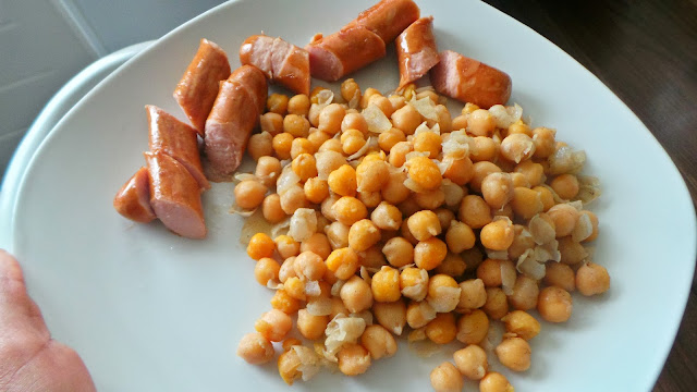 Wat had ik deze dag toch trek in Macdonalds….maar ik wilde mijn geld niet aan iets ongezonds uitgeven. DUS toen had ik snel kikkererwten uit een potje laten uitlekken en gebakken met wat uitjes, komijnpoeder, zout en zwarte peper. Ook had ik nog wat Turkse knakworstjes die had ik in een koekenpan gebakken en voila: instant healthy lunch met ontzettend veel proteine 😀 Ik at dit met wat ketchup en sambal oelek: aanrader!